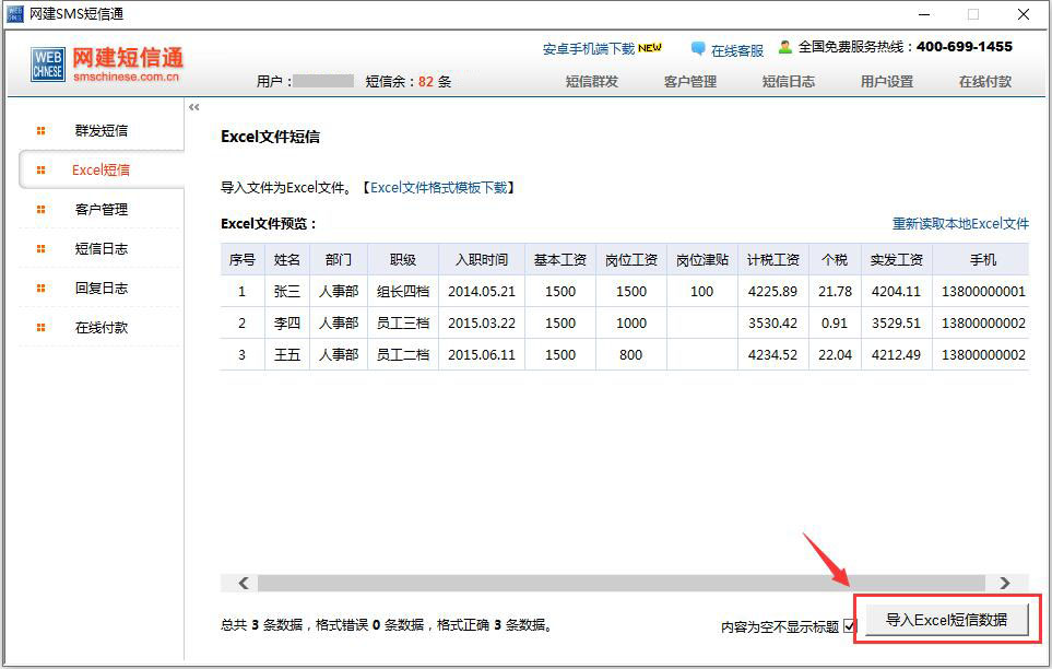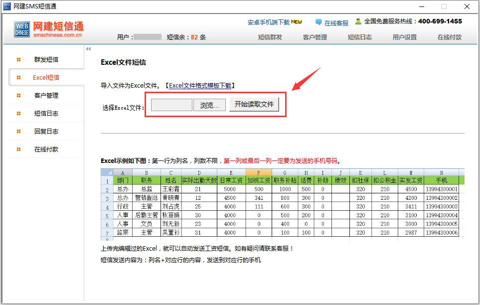 Excel文件发送短信。应用于Excel发送工资短信、Excel发快递短信、Excel发水电费明细短信等,行业领域内的带Excel变量的短信文件。优点:速度快、操作简单。